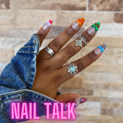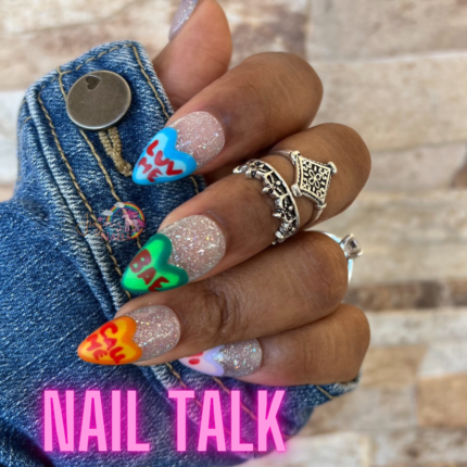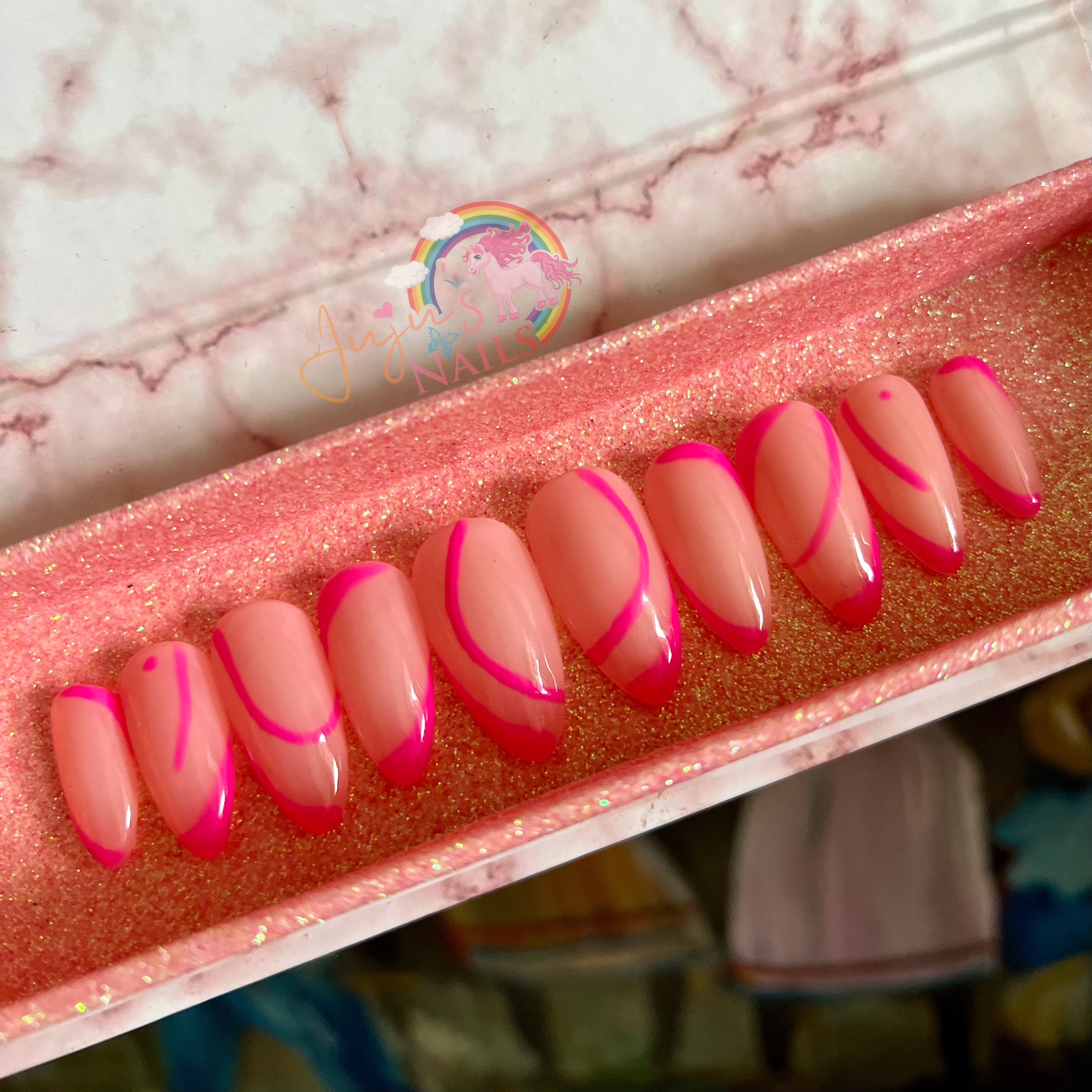 Acrylic Almond Mid Length Nude High Gloss, Pink Abstract Hand Paint Nail Art.