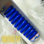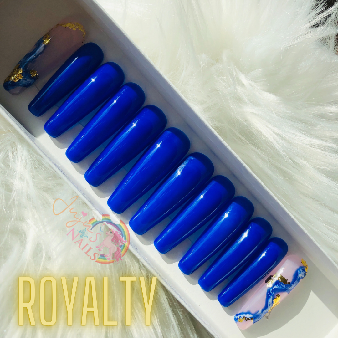 12 Coffin Shape Xtra Xtra Long Acrylic 10 Royal Blue 2 natural Pink/Marble/Gold Accent Nails. Perfect for any occasion. Shape can be changed to Stiletto add comments in notes at checkout otherwise set will come as shown.
