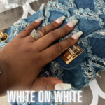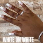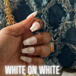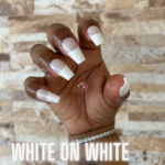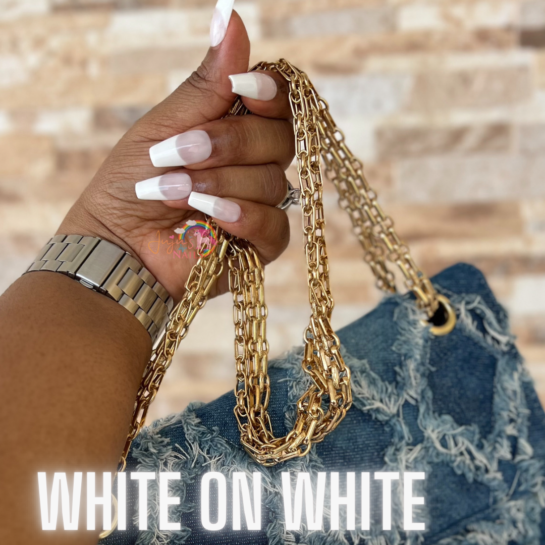 Mid Length/Coffin Shape, Acrylic Classic French White Tip with Marshmallow White natural nail line to give the white on white illusion. High Gloss, Matte is available leave comment at checkout.
