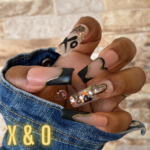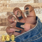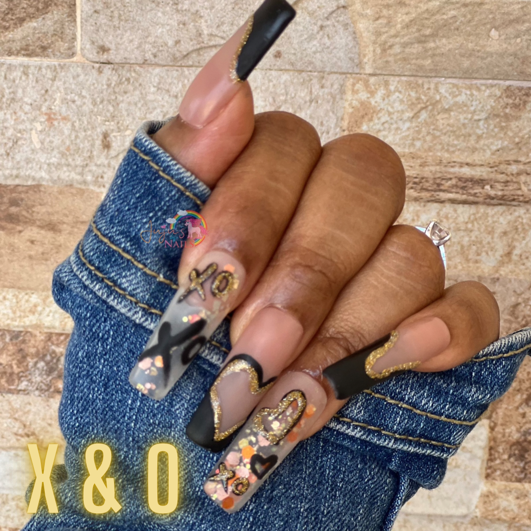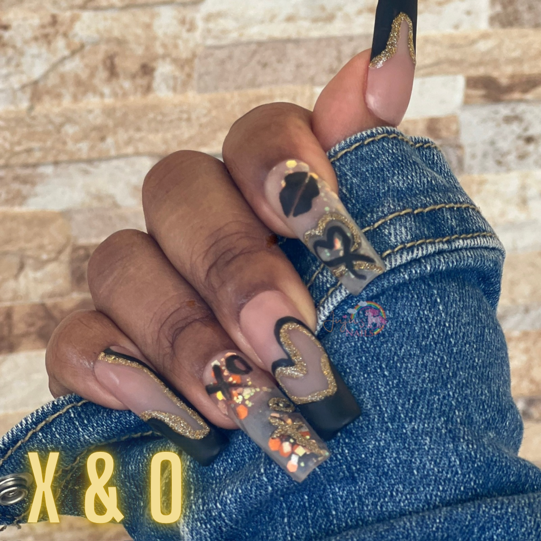 Xtra Long square all Acrylic, Handpainted embedded Glitter Black & Nude Nails (12). Perfect for any occasion elegance meets art made with Love.